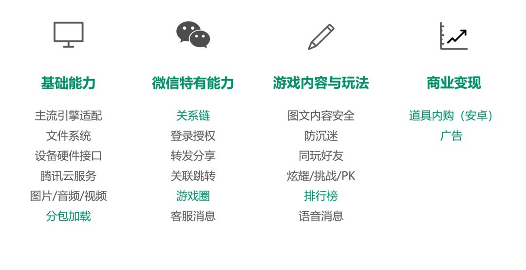 大家可以从基础能力、微信特有能力、游戏内容与玩法、商业变现四个方面理解开放能力。如分包加载、防沉迷、内容安全等基础能力能帮助开发者提升开发效率,降低风险。