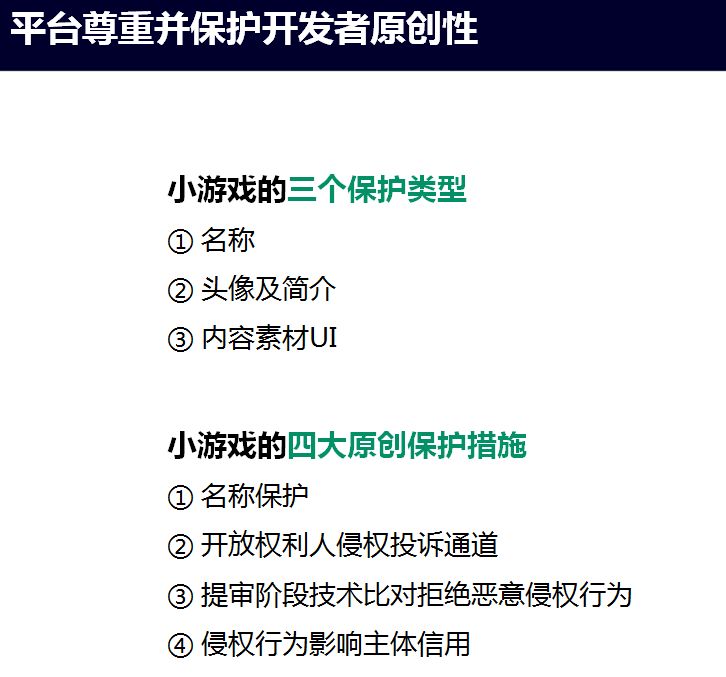 有力的原创保护能为小游戏开发保驾护航。微信小游戏平台会更注重游戏的原创性,保护好原创小游戏开发者的权益。