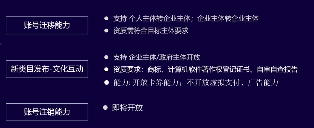 此外,小游戏平台目前已推出账号迁移能力和新类目-文化互动。接下来,还将推出账号注销等能力,帮助开发者更好地运营小游戏。
