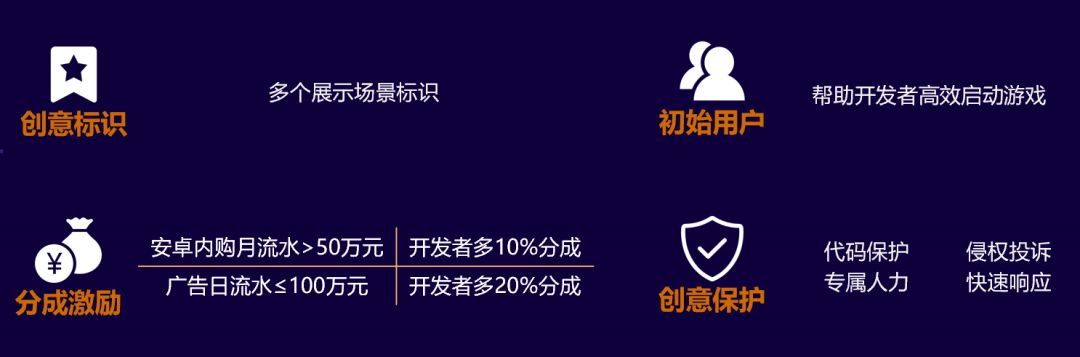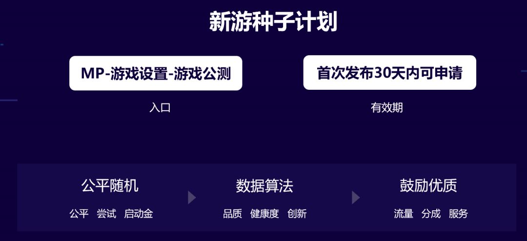 首次发布30天内的小游戏可以申请“新游种子用户”计划,快速获取“种子”用户,加快小游戏成长。特别优质的游戏,比如创意小游戏可以获得更多的价值和服务,平台将提供不限于流量、分成、服务的支持。