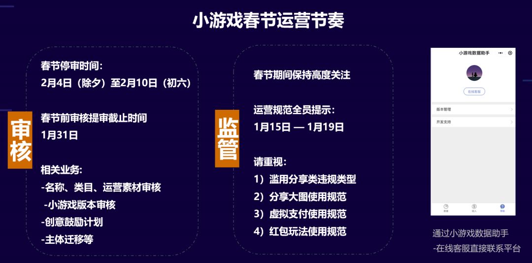 春节期间,平台的监管会一直保持高度关注的状态。开发者务必要详细阅读运营规范,尽快地自查整改,尽量保证在1月31日前提审,避免影响版本迭代。如春节期间遇突发问题,可以通过小游戏数据助手在线客服联系客服人员,当日一定会有人员回复。