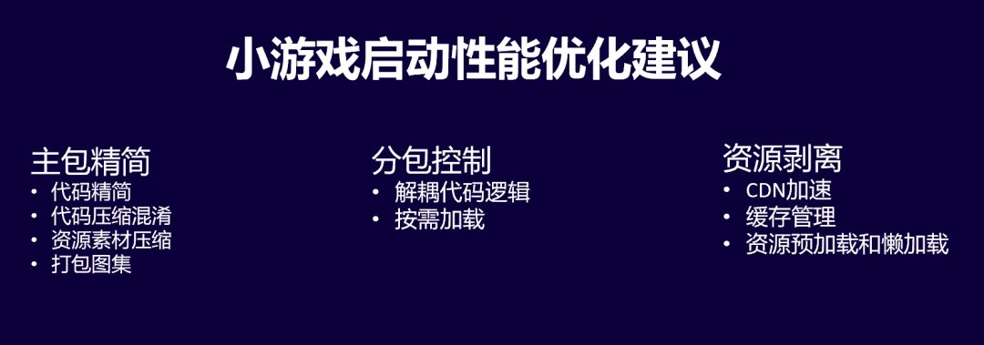 首先要做主包精简,当主包过大的时候可以考虑分包加载;对于资源比较大的游戏,可以去做资源分离,同时也要控制资源本身的加载。此外,小游戏平台本身也在不断规划新的能力提供给开发者,帮助开发者提高小游戏加载启动的速度。